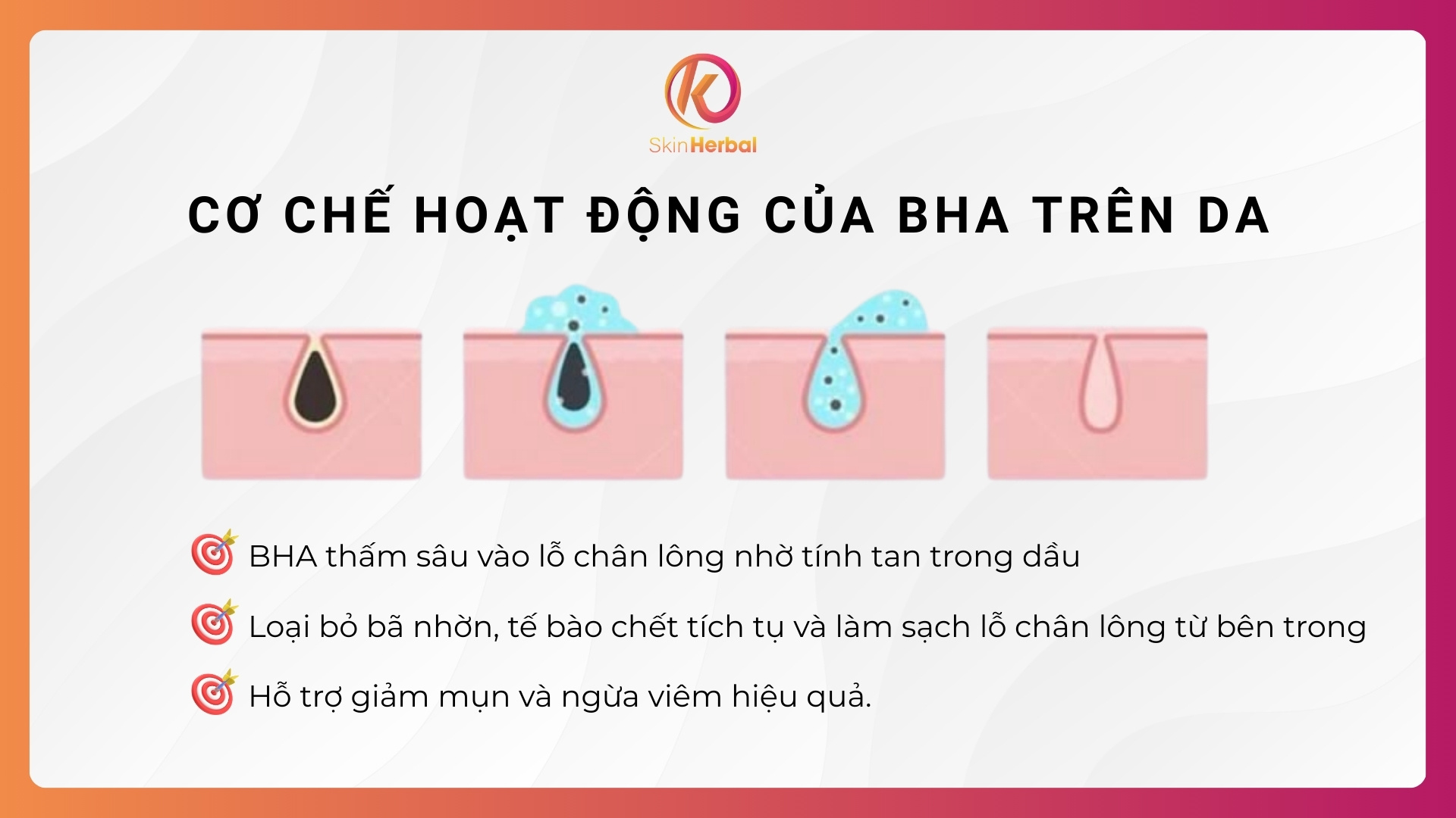 Khác với AHA tan trong nước, BHA có khả năng thấm sâu vào lỗ chân lông nhờ tính tan trong dầu. Điều này giúp loại bỏ bã nhờn, tế bào chết tích tụ và làm sạch lỗ chân lông từ bên trong, từ đó hỗ trợ giảm mụn và ngừa viêm hiệu quả.