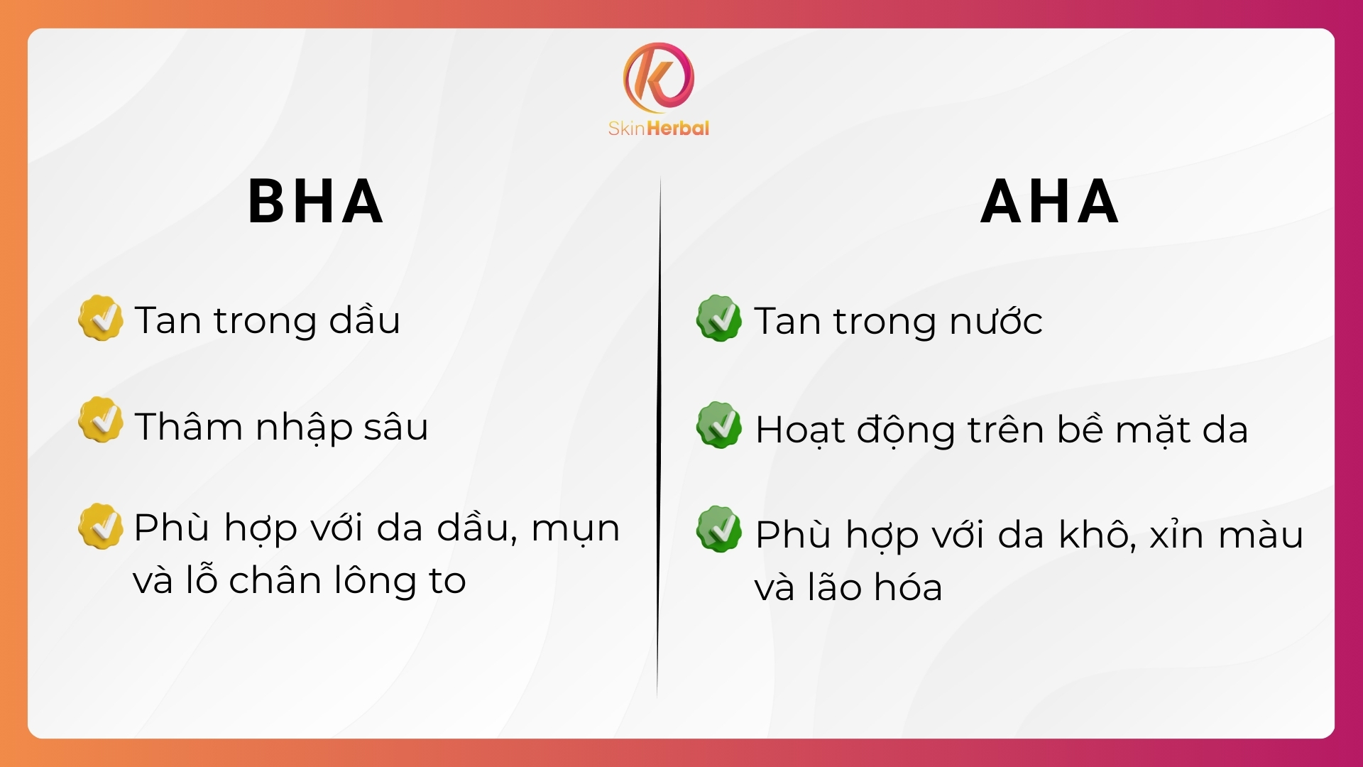 - BHA: Tan trong dầu, thâm nhập sâu, lý tưởng cho da dầu, da mụn, lỗ chân lông to.